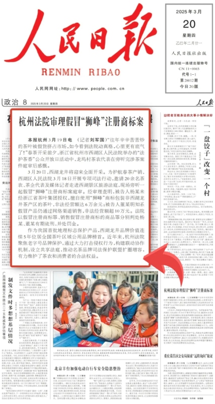 3月20日,《人民日報》刊發(fā)“杭州法院審理假冒‘獅峰’注冊商標案”一文,權威點(diǎn)贊杭州市重拳捍衛西湖龍井“金字招牌”。